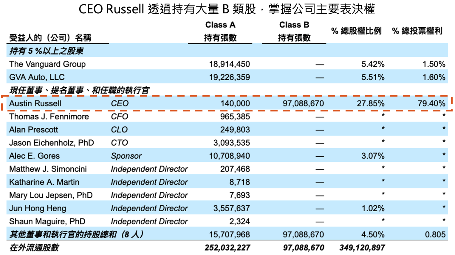 股權結構方面, Luminar 採用 A、B 股雙重股權結構(兩者皆為普通股,但每股 B 類股投票權是 A 類股的 10 倍),CEO Russell 一人就持有公司 27.9% 的股權,並握有公司 78.4% 投票權,股權及投票權都集中在創辦人手中。