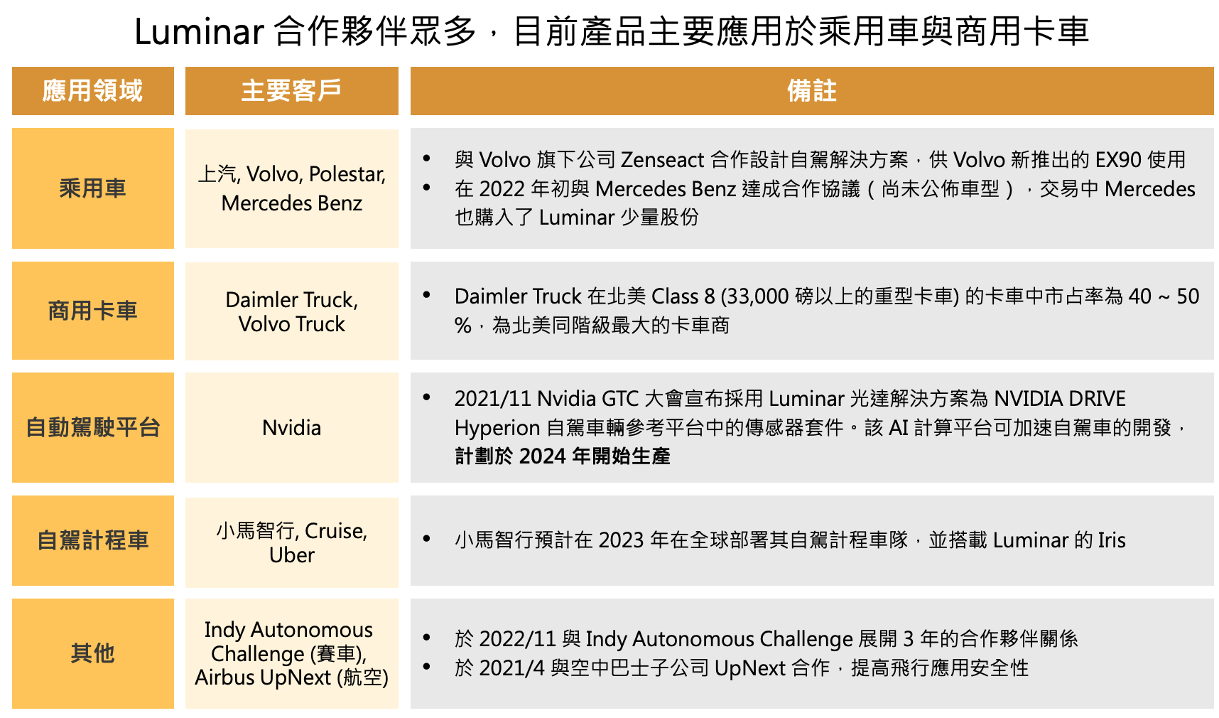 Luminar 自成立以來已經與超過 50 家公司建立合夥關係,包括全球主要的汽車製造商,以下為其各領域主要合作夥伴: