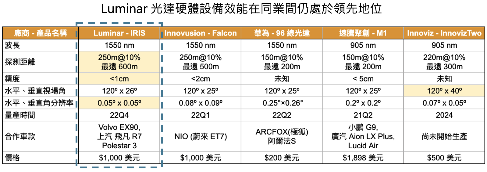 Luminar 近期主要與中國上汽集團和 Volvo 合作,將於 2022 年底至 2023 年初與商用車廠開始量產 Iris