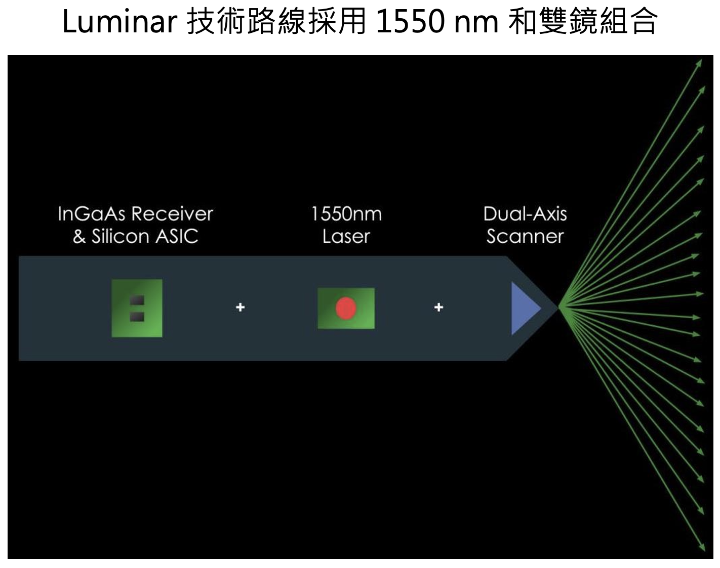 目前市場上最常見的光源波段為 905 nm,並以矽作為接收器的材料 ; 而要吸收波長1,550 nm 的光源,需使用成本較高的 InGaAs(砷化銦鎵)做材料,但也因其能在提高功率(功率越高,探測距離更遠)情況下維護人眼安全,使 Luminar 產品綜合效能目前領先市場。