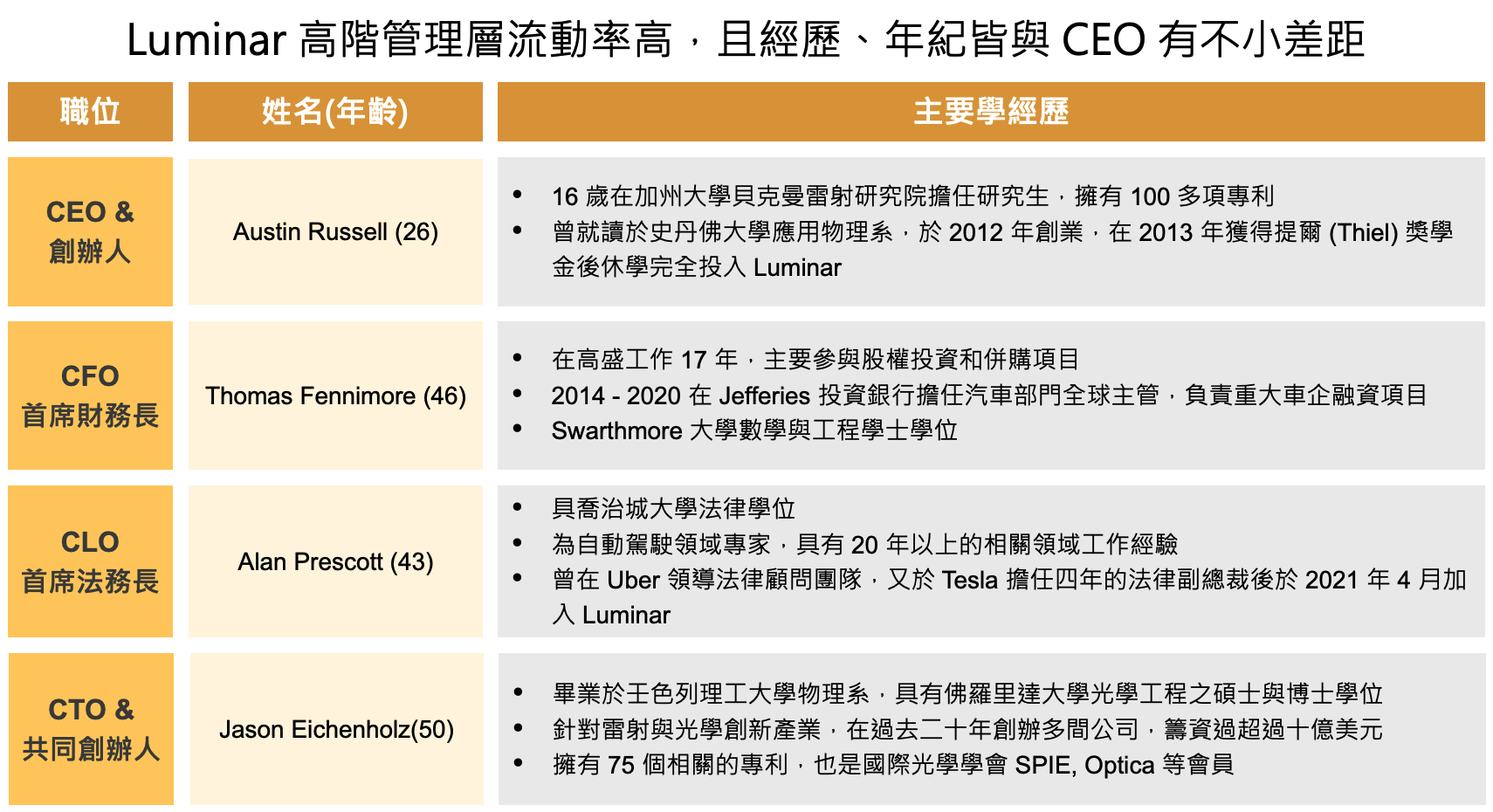 除了創辦人兼 CEO - Austin Russell 外,其餘經營層多在汽車自駕和光學產業皆具有多年的工作經驗。Luminar 近年也挖角了許多在同業間的高階幹部, 然在 2021 年底,Luminar 的 CBO(首席業務長)也被挖角去量子產業公司,高階管理層流動率高,未來可能需注意經營層更換過於頻繁的潛在風險。