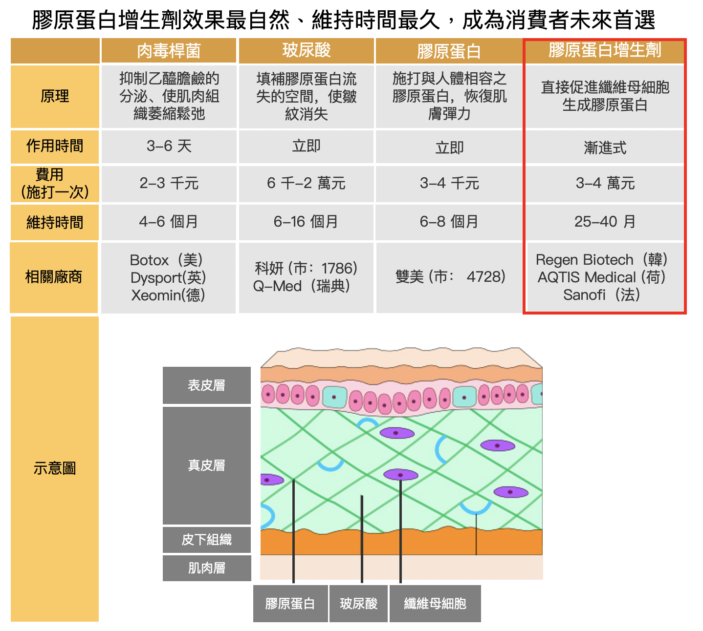 目前膠原蛋白增生劑廠商由韓國 Regen Biotech 生產的艾麗斯、荷蘭 AQTIS Medical 生產的洢蓮絲,以及法國 Sanofi 生產的舒顏萃為主,韓國 Regen Biotech 所生產的艾麗斯,在台灣由曜亞(櫃:4138)獨家代理,也是近期曜亞營收成長的主要原因。