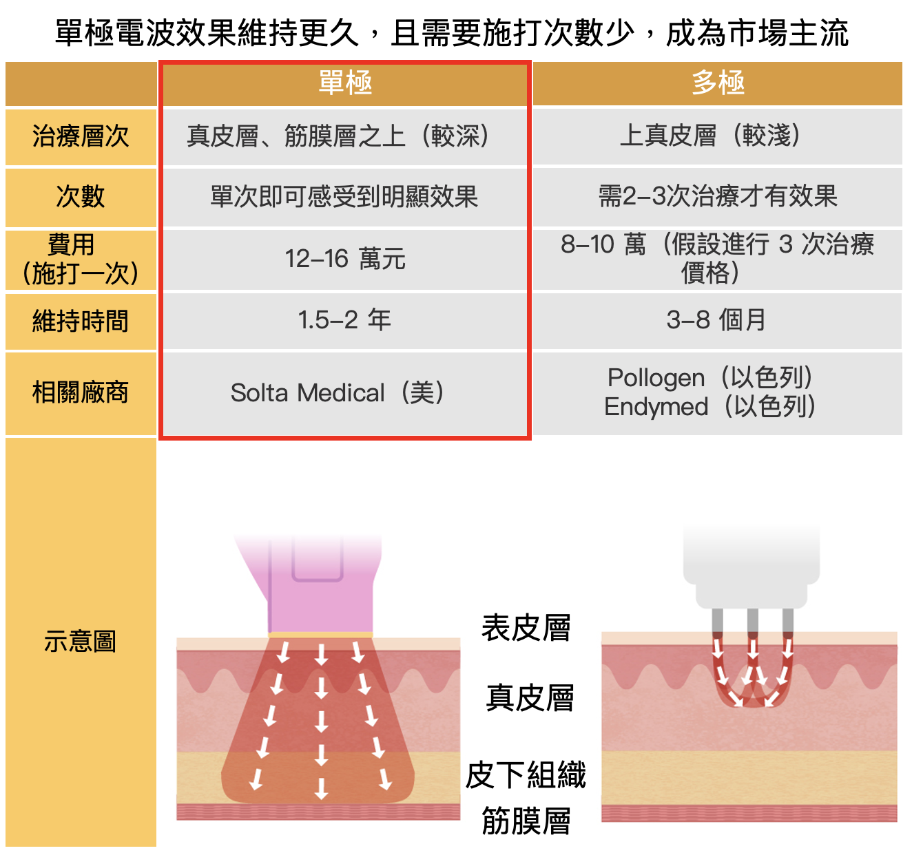 電波拉提的領先廠商是 Solta Medical,也就是市面上常聽到的鳳凰電波,擁有專利單極射頻技術(可參考下表),相比大多廠商擁有的多極技術可以更全面、深層的進行加熱,雖然相比起多極會有疼痛感,但由於可以有更佳且更久的效果;此外在全球有超過 17 年的臨床經驗,並擁有 50 篇以上專業的臨床醫學文獻證實其電波拉提儀器的安全性與有效性,產品力高,使其成為目前市佔最大的電波拉提儀器品牌。銷售方式是由同母公司的博士倫(NASDAQ:BLCO)直接販售機器給各國醫美診所,可降低代理商的溝通及代理成本。