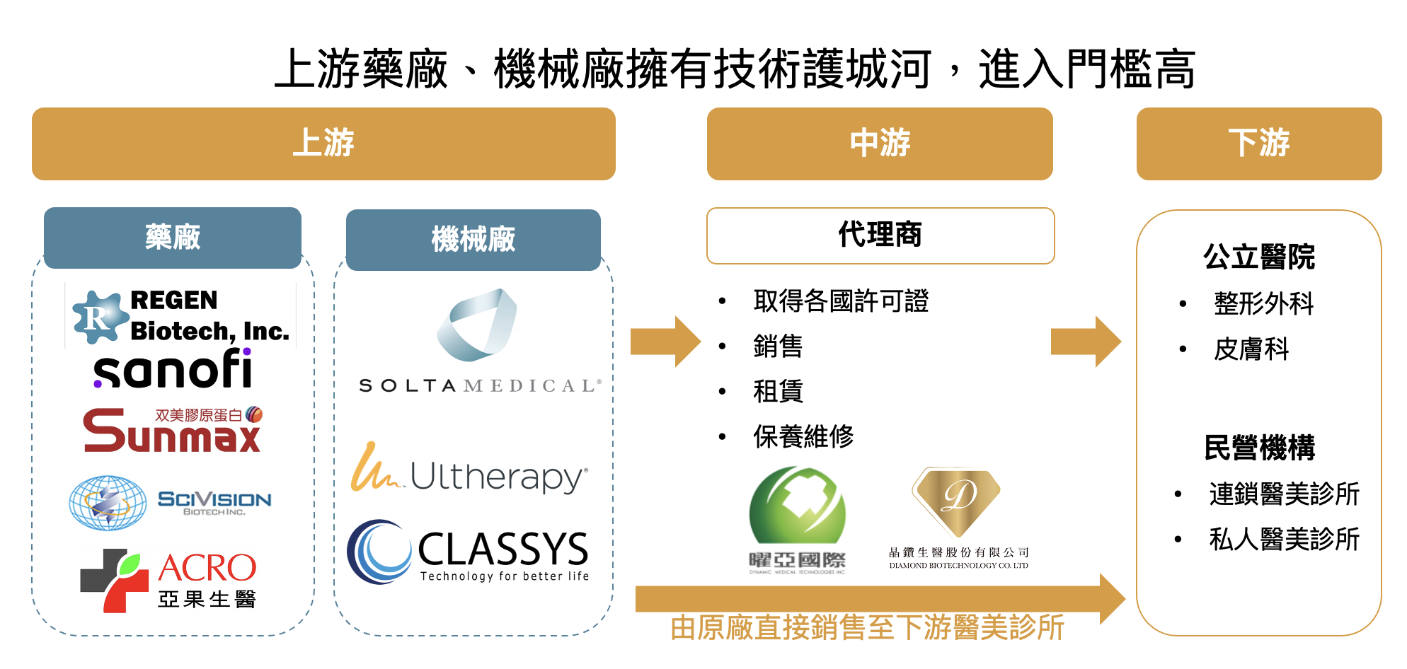 輕醫美產業鏈可分為上游廠商:藥廠、機械廠,中游:代理商,下游:美容機構(醫院/診所),上游藥廠或醫療器械廠需取得相關認證,市場集中度較高,因此對下游議價能力強,而相較於代理商,美容機構(醫院/診所)因需要有執照的醫生進行執業,具更高的產業門檻,因此目前也觀察到由上游原廠直接銷售至醫美診所的模式開始興起(略過代理商)。