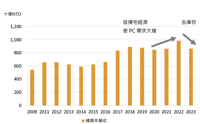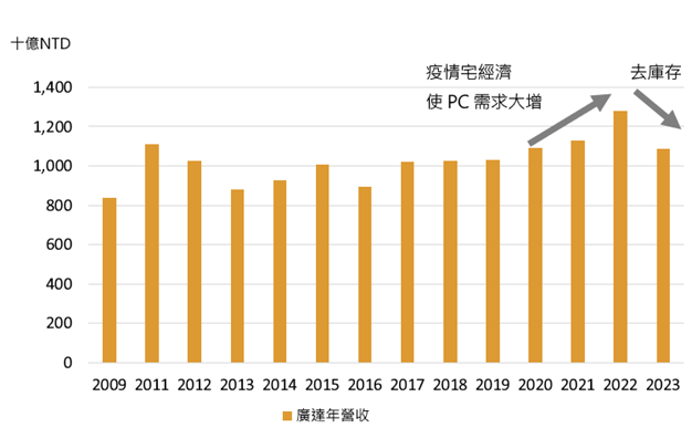 兩間公司營收皆以 PC(包含 NB)為主,因此營收主要隨著 PC、NB 市場好壞而波動。PC 出貨量在 2011~2012 年到達高峰後開始邁入成熟期,每年出貨量約維持在 2.5~3 億台左右水準。直到 2020 年因疫情帶動的宅經濟,才讓 PC 需求短暫大增,在 2021 年達到高峰,全球出貨 3.41 億台,YoY+15%。然隨疫情結束 PC 需求亦回歸常態,2023 年出貨量為 2.47 億台,YoY-13%,回落至疫情前的水準。