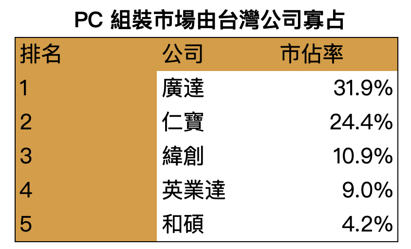 廣達、緯創分別是全球第一、第三的 PC/NB 組裝代工廠(市佔率為 32%、11%),與仁寶、英業達、 和碩合稱台灣的電子五哥,五家公司合計 PC 代工市佔率高達 80%,寡佔整個市場,商業模式採連工帶料模式。然因附加價值較低,且產業屬買方市場(也就是代工廠無議價權),這幾家公司過往的毛利率長期都只有 3~5%,更常被戲稱為茅山道士,長期未獲投資者青睞,使過往 P/E 估值都只有 10X~12X 左右。