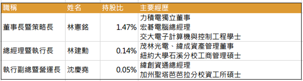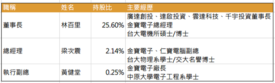 經營團隊:廣達、緯創經營層皆為公司創辦人並仍在掌舵,擁有豐富產業經驗及人脈資源