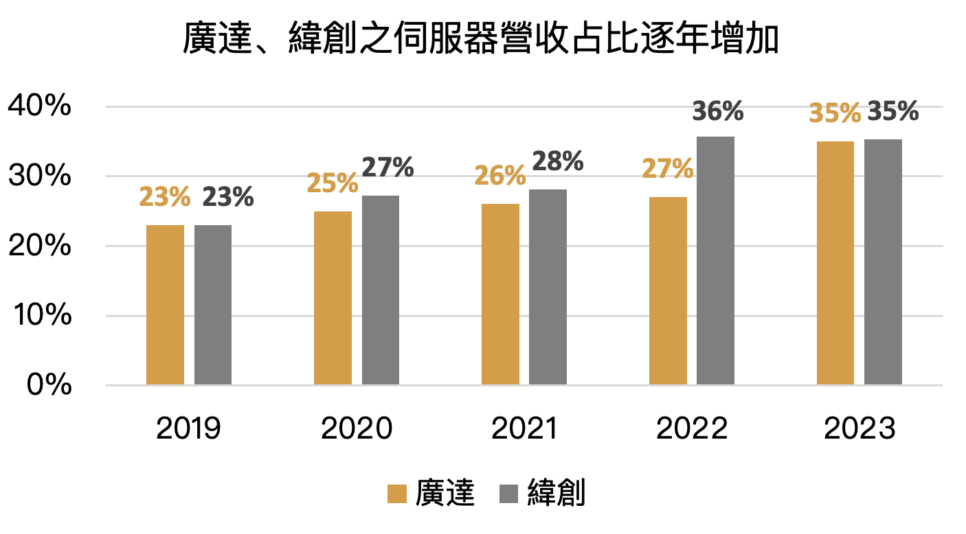 為擺脫產業惡性循環,廣達、緯創兩家公司經營層很早就佈局伺服器代工領域,從 2010 年就和 Nvidia 等公司合作開發伺服器組裝,且有參與設計而非單純代工(亦即 ODM 模式),因此也是 AI 伺服器需求增加的最大受惠者。