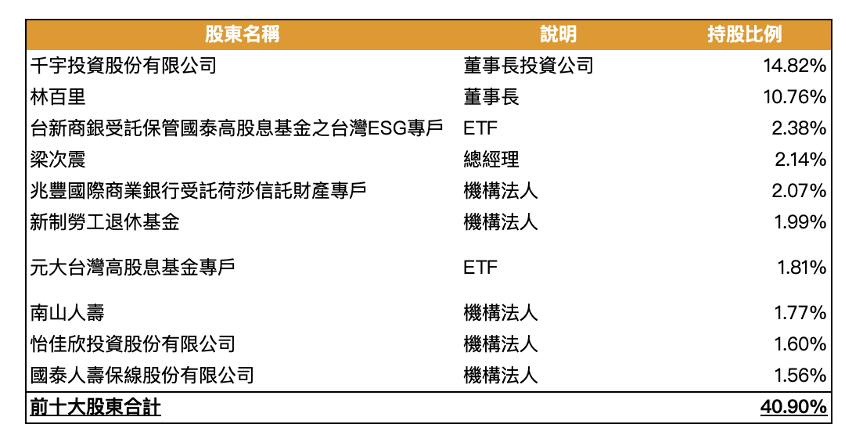 廣達股權約有 26% 集中在董事長林百里及其名下投資公司千宇投資手中,總經理梁次震則持有 2.1%,其餘大股東則多為 ETF、人壽、退休基金,前十大股東持股達 43%,千張以上股東持股比達 87%,股權集中穩定。