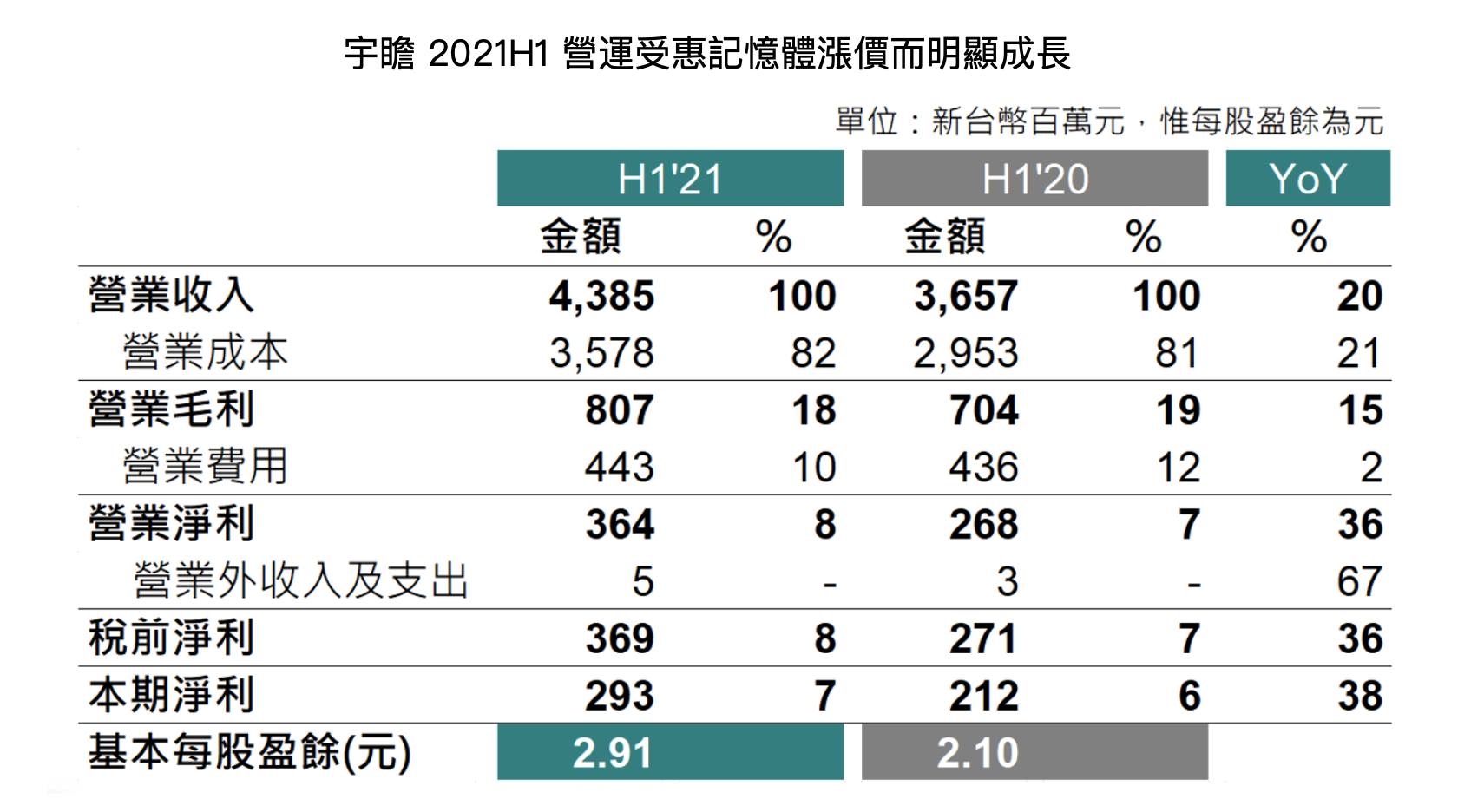 2021 上半年營收為 43.9 億元,YoY+20.0%,毛利率 18.4%,YoY-0.9 ppts。EPS 為 2.91 元,YoY+0.81 元。整體營運及獲利在 DRAM、Flash 價格上漲帶動下而明顯成長。