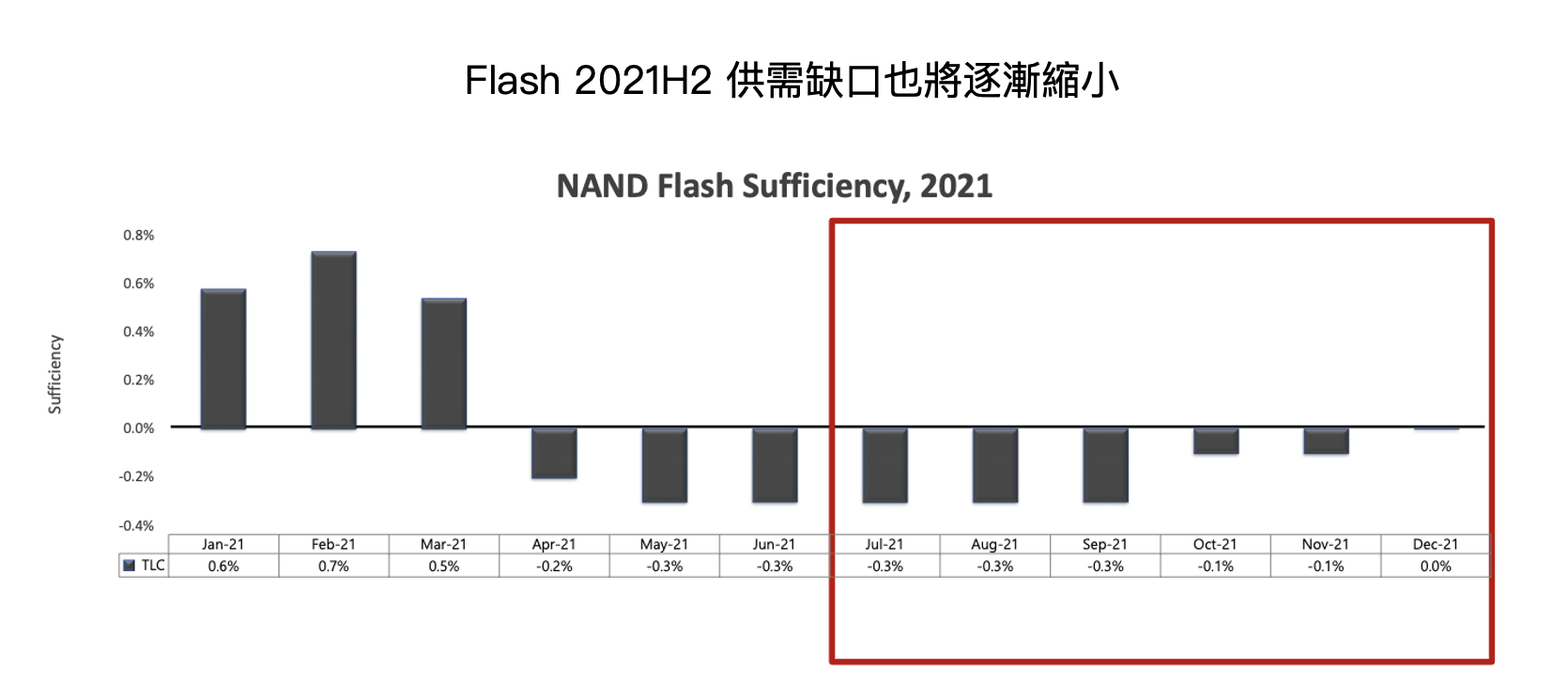 然而展望下半年,雖然資料中心的需求仍然強勁,但帶動此次 Flash 供不應求的奇亞幣近期在中國打壓下需求快速消失,因此公司預估 2021Q3 Flash 合約價雖仍將較 Q2 上漲 5~10%,但 Q4 則可能與 Q3 持平,整體供需缺口將逐季收斂。