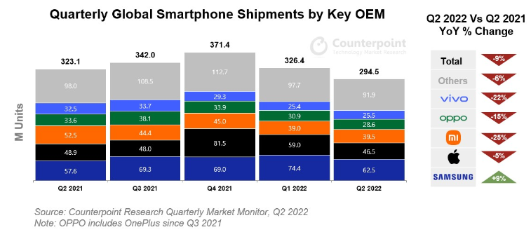 iPhone: 營收 YoY+2.8%、QoQ-14.7%。全球手機 2022Q2 需求降溫,出貨量為 2.95 億台,YoY-9%,而蘋果為 0.47 億台,YoY-5%,衰退幅度小於整體,主因 iPhone13 定位高端,其用戶因收入較高,較未受到通貨膨脹影響。