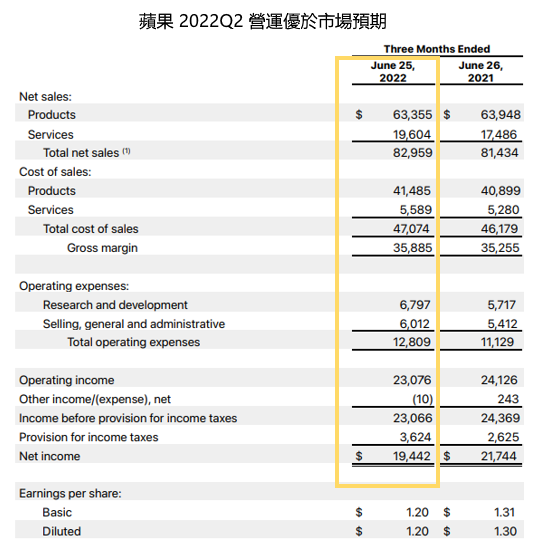 1. 2022Q2 財務:營收為 829.6 億美元(以下同,市場預期 828.1 億元),YoY+11.9%、QoQ-14.7%;毛利率為 43.2%(市場預期 42.6%),YoY 持平、QoQ-0.5 ppts;EPS 為 1.2 元(市場預期 1.16 元),YoY-0.11 元、QoQ-0.32 元,整體優於市場預期。