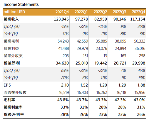營收為 1,171.5 億美元(以下同,市場預期 1,211 億元),YoY-5.5%、QoQ+30.0%;毛利率為 43.0%(財測 42.5~43.5%),YoY-0.8 ppts、QoQ+0.7 ppts;EPS 為 1.88 元(市場預期 1.94 元),YoY-0.11 元、QoQ-0.32 元,營運低於市場預期。