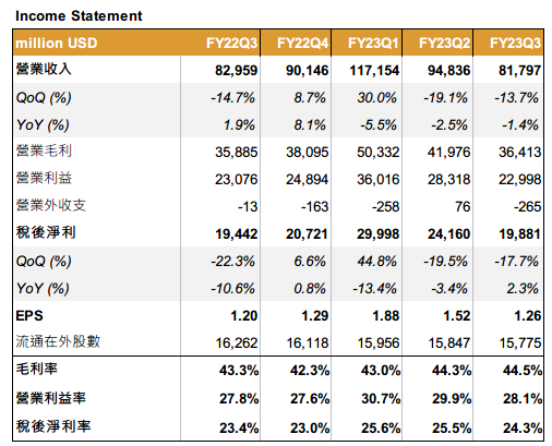 營收為 817.9 億美元,YoY-1.4%、QoQ-13.7%,略超市場預期;毛利率為 44.5%,YoY+2.2 ppts、QoQ+0.2 ppts;EPS 為 1.26 元,YoY-0.03 元、QoQ-0.26 元,整體營運略高於市場預期。