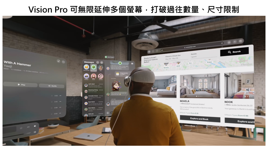 Vision Pro 三大亮點:完善的生態圈體驗、沒有空間數量限制的螢幕顯示、自然的操作方式,將創造全新的休閒、辦公、社交體驗,判斷未來無法移動的螢幕、硬體設備將逐漸被取代