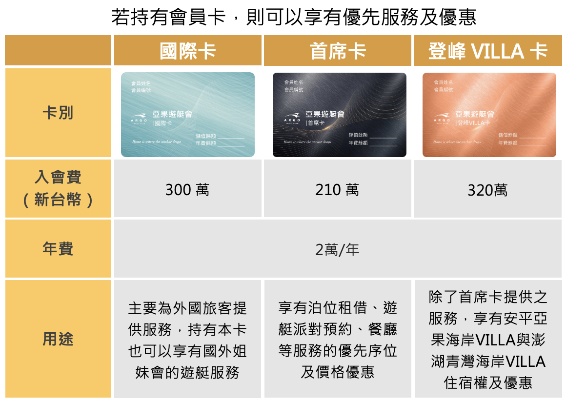 入會費為 210-320 萬元新台幣(以下同),終生享有會員資格,每年需要繳交 2 萬元的年費,除了會員卡本身價格不低以外,有一大部分的會員有遊艇,而一艘遊艇的價格為 2,000 萬元起跳,進入門檻高,因此會員均為高淨值客戶。