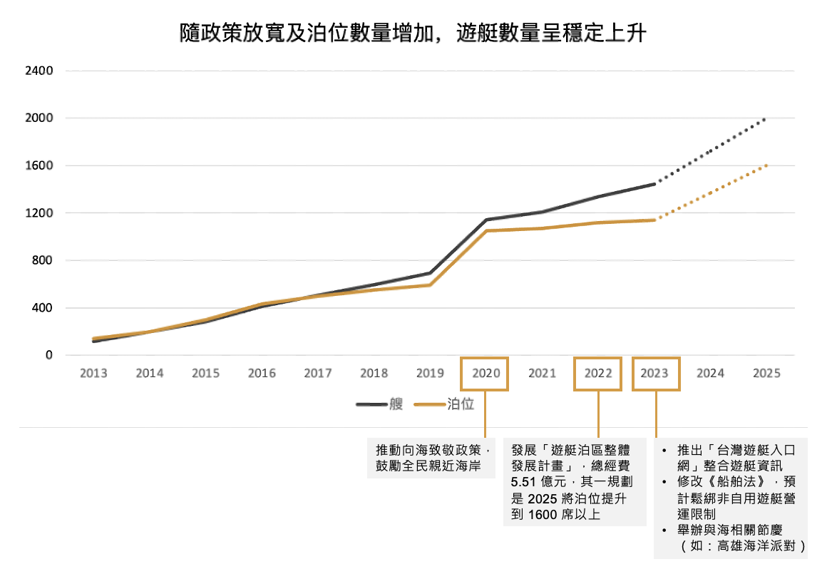 而臺灣是否能追上韓國遊艇數量的關鍵是泊位的數量。韓國在 2018 年就有 2,534 個遊艇泊位,臺灣目前的泊位數是 1,138 個,但自 2022 年發布「遊艇泊區整體發展計畫」後,積極撥經費建置泊位,預計到 2025 年可達 1,600 個,由於台灣遊艇數在過去幾年隨泊位數成長,數量比泊位略多一些。因此若 2025 年泊位數如同預期達到 1,600 個,2023/2024 及 2024/2025 的成長率分別為 20% 及 17%,則遊艇數量則與泊位成長率相同,自 2023 年的 1444 艘成長到 2025 年的 2030 艘。