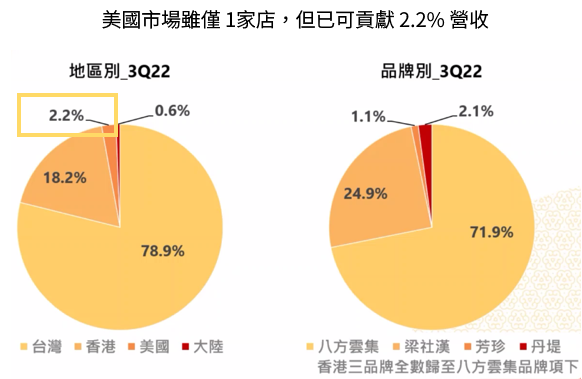 八方雲集:主打水餃、鍋貼等庶民美食,目前共有 1,092 間門店,其中台灣 1,004 家、香港 70 家(含百芳 10 家、八方麵屋 5 家)、美國 1 家、中國 17 間(2022 年初 25 家,預計於 年底全面撤出)。目前以全加盟店為主,且外帶、外送佔比高達 78.6%,客單價約 150 元。未來除美國外,其他店面會注重在店內消費體驗的改裝,並於 2023Q2 導入冷凍調理包販售,增加額外營收。