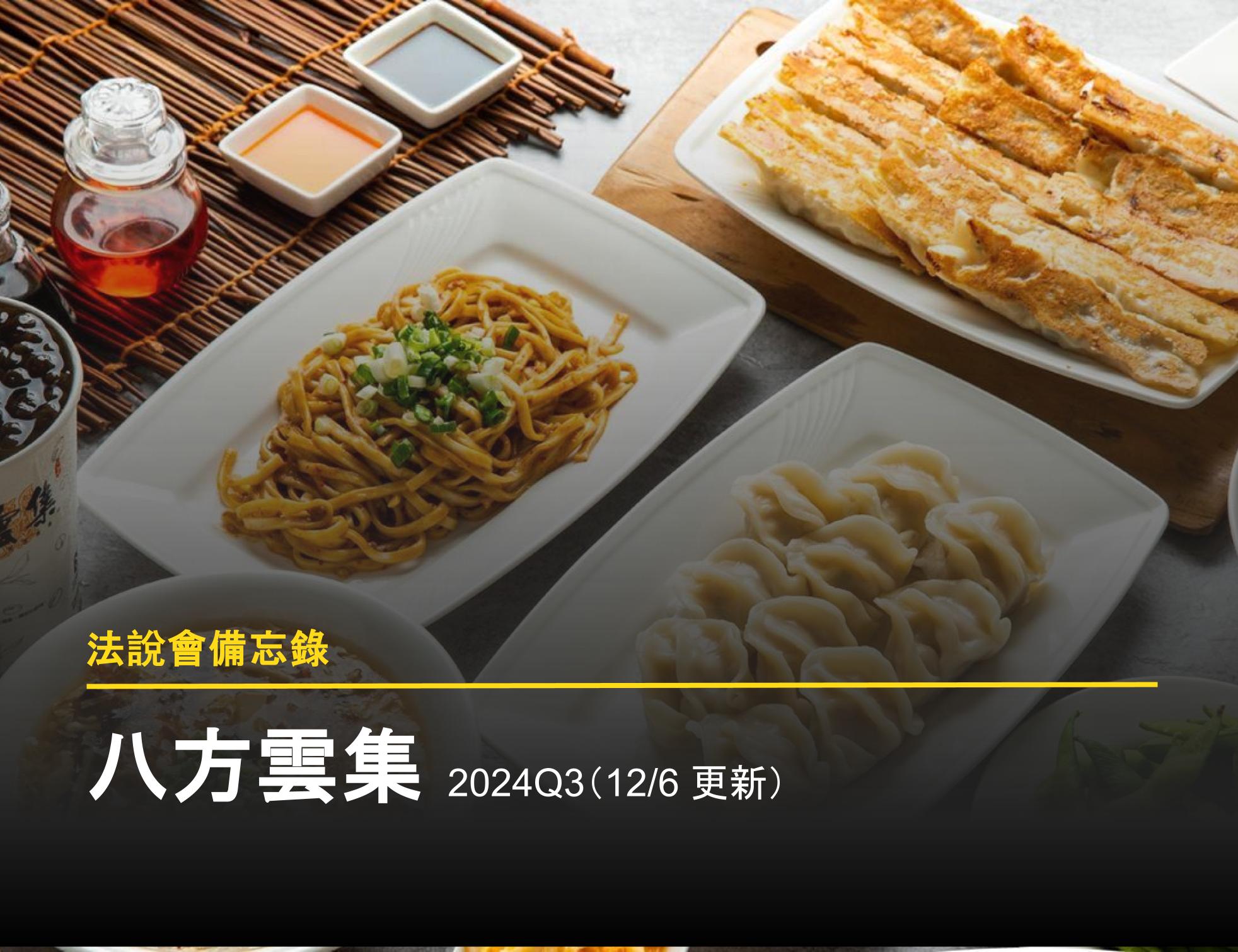 1.公司 2024Q3 營收占比為台灣 75.6%、香港 17.6%、美國 6.9%;目前旗下有 7 個品牌,營收佔比為八方雲集 72.8%、梁社漢排骨 23.9%、芳珍蔬食 2.7%、丹提咖啡 0.6%。
