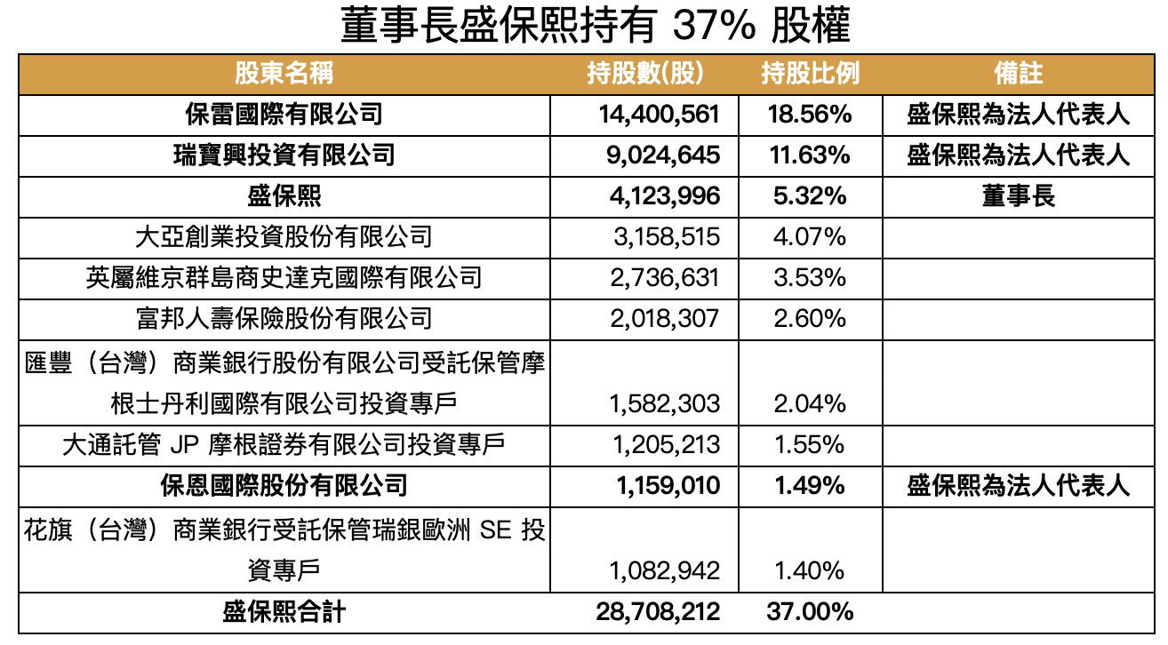 董事長盛保熙掌握 37% 股權,對公司決策擁有相當大的控制權,商學背景使其具有併購決策眼光,過去 10 年成功透過併購提升公司營收