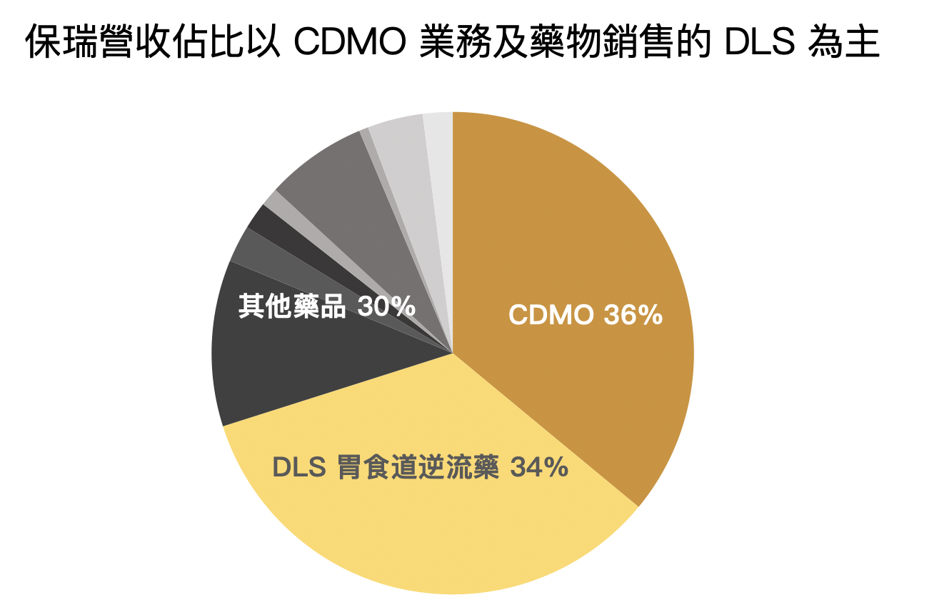 保瑞營收佔比為 CDMO 36%,胃食道逆流藥物 DLS 34%,其餘為其他藥品銷售。以下將詳細介紹 CDMO 業務及胃食道逆流藥物 DLS: