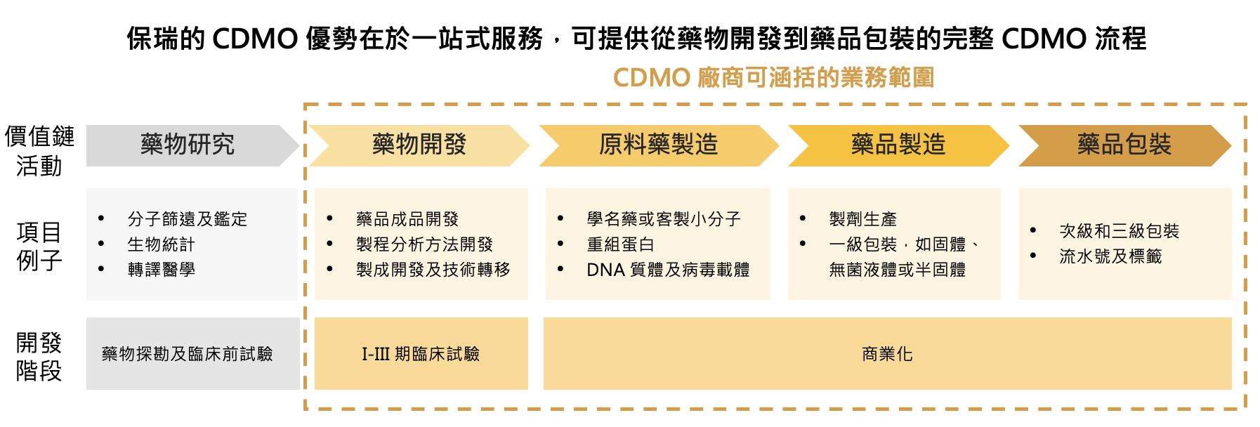 註:CDMO(Contract Development Manufacturing Organization 委託開發暨製造服務)是依照藥物類型及全球客戶所在地或需求不同,提供完整大、小分子藥物,從劑型開發、產品檢驗、查驗登記、生產製造、藥品包裝、上市後通路銷售等全方位服務。