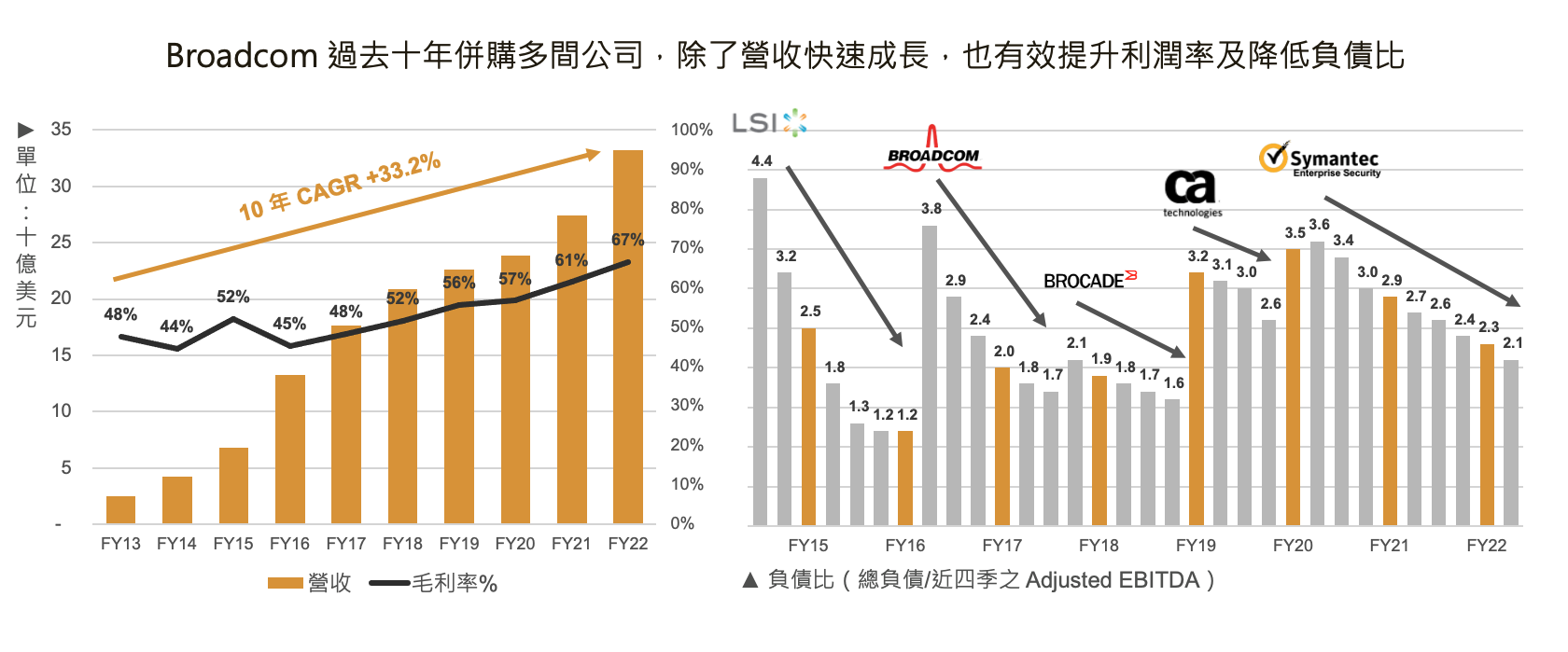 公司其餘經營團隊則有多位被併購公司之高階主管,從 Broadcom 過去 10 年營收以 33.2% 的 CAGR 來看,且同時提高利潤率,併購也能有效去槓桿、降低負債比,經營層在整併公司後的管理具經驗且多能創造更好的績效。