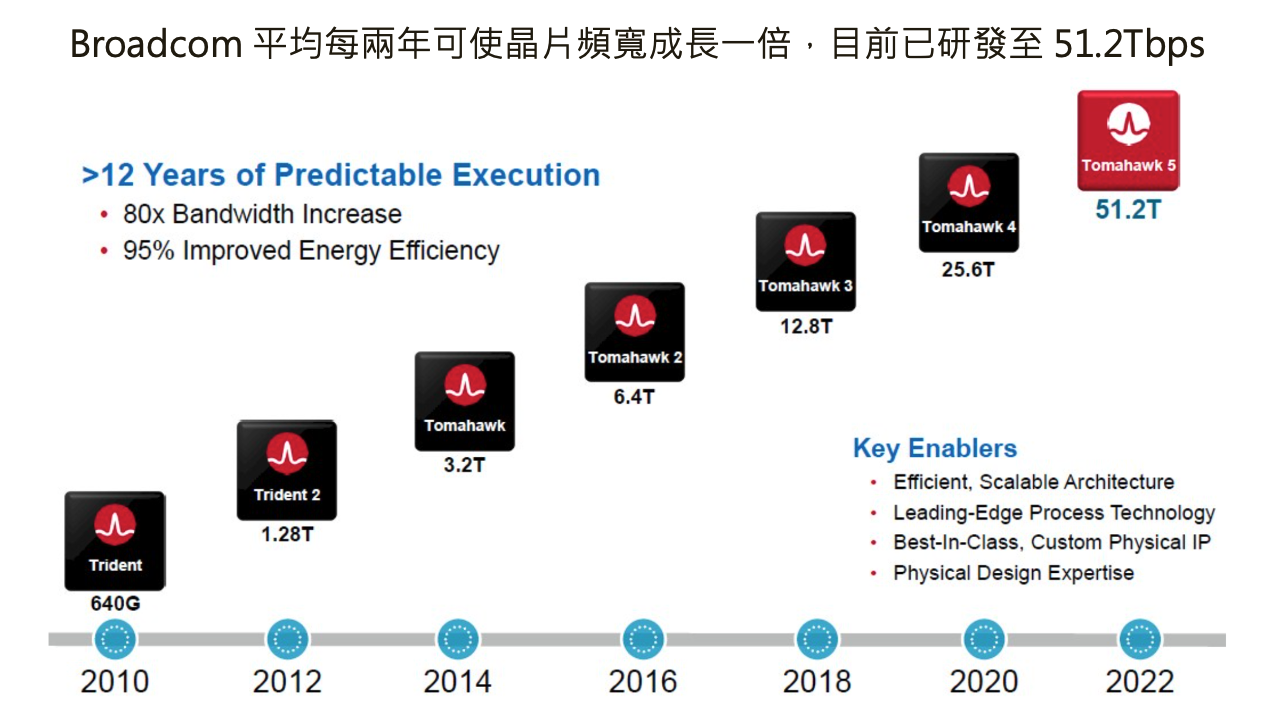 Broadcom 自 Tomahawk 1 以來,約每兩年可以將其交換器晶片之頻寬翻倍,在 2022/8 月,Broadcom 推出了支援 800GbE 的交換器晶片 Tomahawk 5,頻寬成長一倍至 51.2 Tbps,預計 2023 年 Networking 部門將受惠 Tomahawk 5 占比提高,帶動整體 ASP 成長。