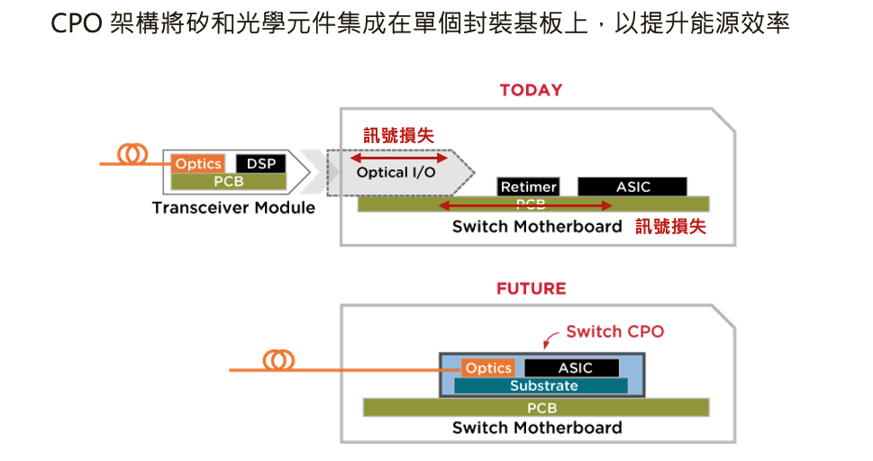 Tomahawk 4、5 均推出使用 CPO(Co-packaged Optics,共同封裝光學元件)技術封裝的晶片版本,CPO 與傳統熱插拔(光收發模組)技術不同,CPO 將矽光晶片、交換器晶片、RF 晶片等共同封裝,減少過去訊號傳輸需經過多個媒介(包含連接器、PCB、IC 載板)進而降低訊號與能量的損失。