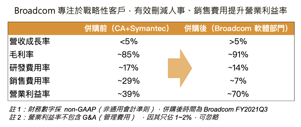 Broadcom 並沒有將軟體業務與晶片本業相結合,而是整併後提高被併購企業的經營效率。檢視近五年併購的軟體企業(CA 及 Symantec),Broadcom 透過降低多餘的人事費用、刪去重複的資源,並將軟體服務從買斷制改成訂閱制提升收入、Cross-sell 兩間公司的服務,使軟體部門之營業利益率從整併前之 39% 拉升至 70%。