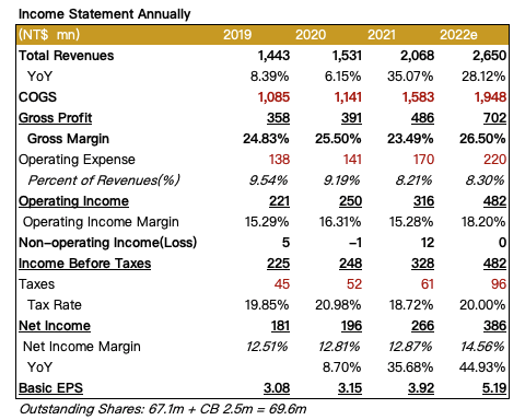 營業費用部分因公司須持續添增人力及付加班費,假設維持 8.3% 之比率;有效稅率則假設為 20%,則可推估 2022 年稅後淨利為 3.86 億元,YoY+44.9%。
