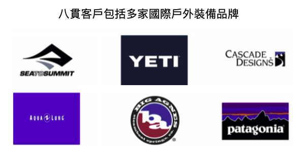 八貫戶外產品包括露營睡墊、潛水浮力背心、防水背包、充氣頸枕、保冷袋等。客戶則包括 澳洲戶外裝備品牌 Sea to Summit、美國冰桶製造商 YETI、美國戶外服飾品牌 Patagonia、美國戶外裝備品牌 Cascade 等 20 家國際公司,且有約 40% 的客戶八貫都是 Tier 1 供應商。例如八貫為 Sea to Summit 充氣睡墊、YETI 軟式保冷袋布料唯一供應商、並供應 Cascade 露營睡墊超過 80% 的布料。