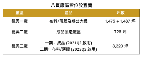 公司目前於宜蘭冬山共有三座廠房,其中布料、薄膜月產能約 100 萬碼(目前機台僅週休一日,產能約 115~120 萬碼。其中 50 萬碼為航空用布料)、醫療床/露營睡墊月產能 3.5 萬床、醫療管材/其他產品月產能 24 萬支。