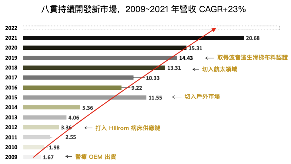 公司自轉型以來持續開發新市場,先後打入醫療、戶外及航太市場,使其在過去十餘年來營收都持續成長。