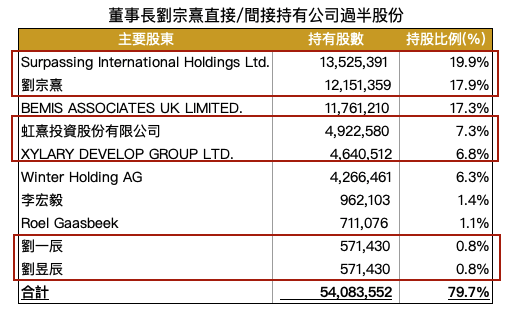 董事長兼總經理劉宗熹透過個人、關係人(Surpassing、虹熹、Xylary、兩位兒子)共持有公司約 54% 股份,劉先生雖為二代接班,但觀察其過往豐富的學經歷(美國康乃爾大學電機碩士,成功大學機械學系、工管系),及上任十餘年的優異經營績效都證明其為優秀的管理者,另加上研究團隊親自拜訪交流的感受,因此對於此股權集中的狀況採正向態度。