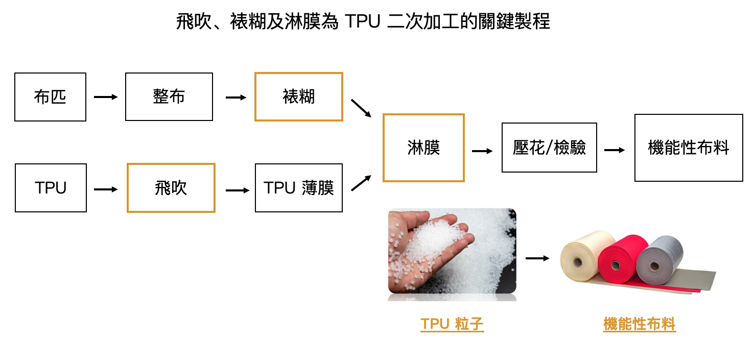 其流程為先將布匹經由驗布機檢驗,過關後會進入裱糊機,在表面塗上數層化學糊劑並烘乾。接著進入淋膜機,淋膜機的兩端一邊放布,一邊則放上利用飛吹製程把 TPU 粒子形成的 TPU 薄膜,再利用兩邊的溫差冷卻把 TPU 薄膜貼合到布料上,最後再根據產品需求進行壓花、檢驗,成為右下圖的機能性布料。