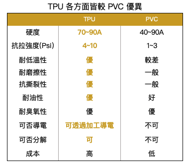 TPU 目前成本仍為 PVC 的 1~2 倍,但下表所示,TPU 在各方面性能都優於 PVC,非常適合用在有特殊需求的機能性布料上,加上 TPU 可分解、無毒的特性,在全球環保意識抬頭下,TPU 未來將逐漸取代 PVC,例如中國十二五計畫中也將 TPU 列為重點發展項目之一。