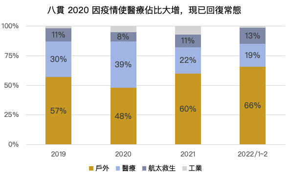 八貫 2021 年營運佔比為戶外用品 60%、醫療 22%、 航太救生 11%、工業應用 7%(2020 年因疫情使醫療佔比大增),毛利率則分別為戶外 25%、醫療 35%、航太救生 45%、工業 15%。公司長期則希望將產品組合調整至戶外 50%、醫療、航太救生各 25%。 以下將逐一分析八貫三大業務的現況及未來成長潛力。