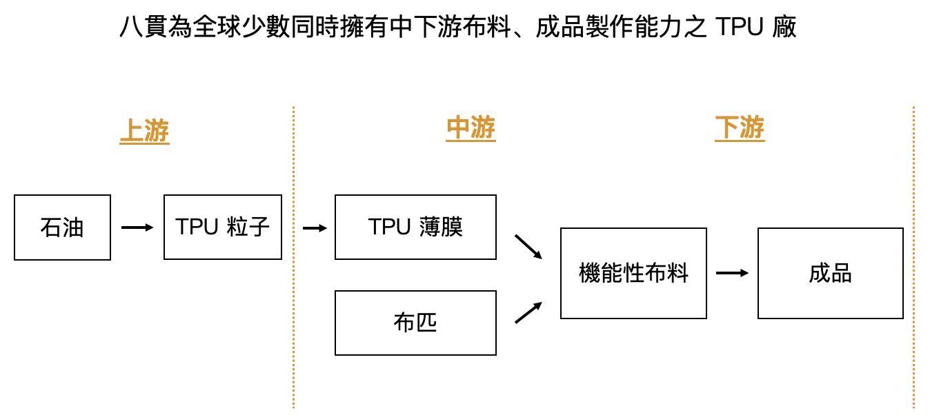 TPU 的製程可分為上游的 TPU 粒子製造,中游的 TPU 薄膜、機能性布料製造(以下稱二次加工)以及下游的成品製造(以下稱三次加工),而八貫為全球少數擁有橫跨中、下游製造能力的公司,且產品幾乎為寡占市場。