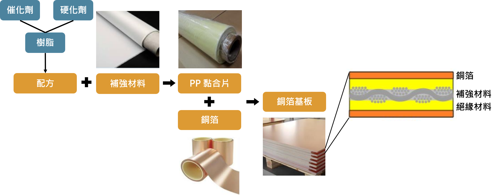 CCL 的製程簡單而言會先將補強材料浸泡至不同的絕緣材料配方中,形成半固化的 PP(Prepreg,黏合片),再將 PP 與銅箔壓合製成 CCL。就成本結構而言,銅箔約占 CCL 成本 35-45%;補強材料約 25-40%;絕緣材料則約為 20-30%。