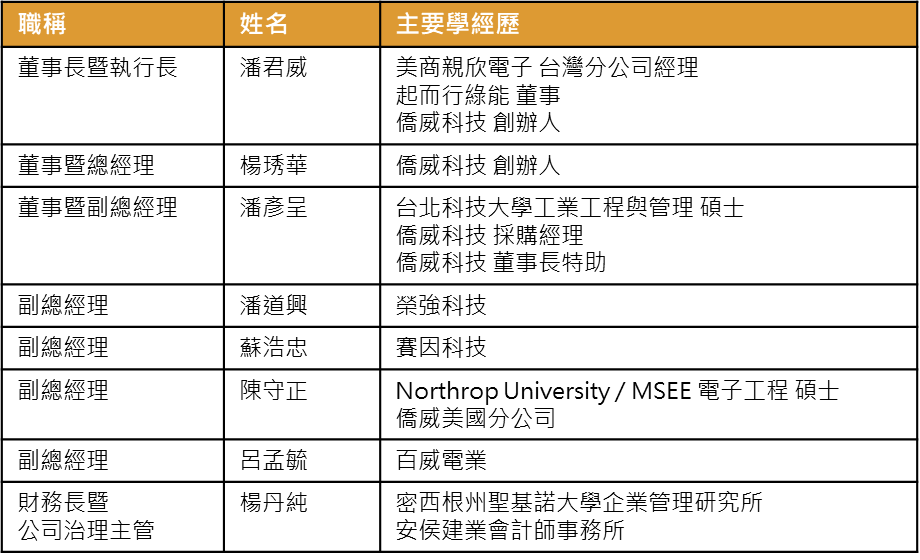 僑威前十大股東除專業投資人盧燕賢及連接器供應商暐翔(櫃:6185)董事長之投資公司春田投資外,其餘皆為董事長及其家族持股,合計持股達 20%,為家族企業。近年隨經營層年齡漸長,董事長也開始培養二代潘彥呈進行接班,未來可再關注二代接任執行長及總經理的狀況。