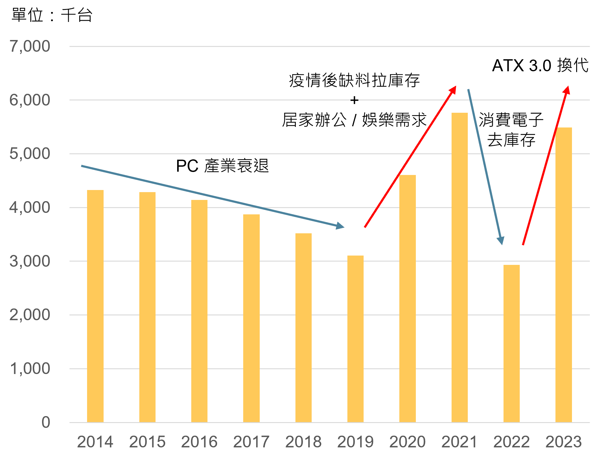 消費型電供市場過去幾年波動劇烈,從 2020 後的拉庫存及居家娛樂需求推升出貨量、2022 消費型電子去庫存導致需求萎縮,到 2023 年因 ATX 3.0 換代帶動需求提升。使得僑威近幾年 PC 電供的出貨量也受到了明顯影響,不過隨市場開始回歸穩定,去庫存及換代需求都告一段落,判斷 2024-2025 年僑威 PC 電供出貨量會回歸到 4000-5000 千台的正常水位。