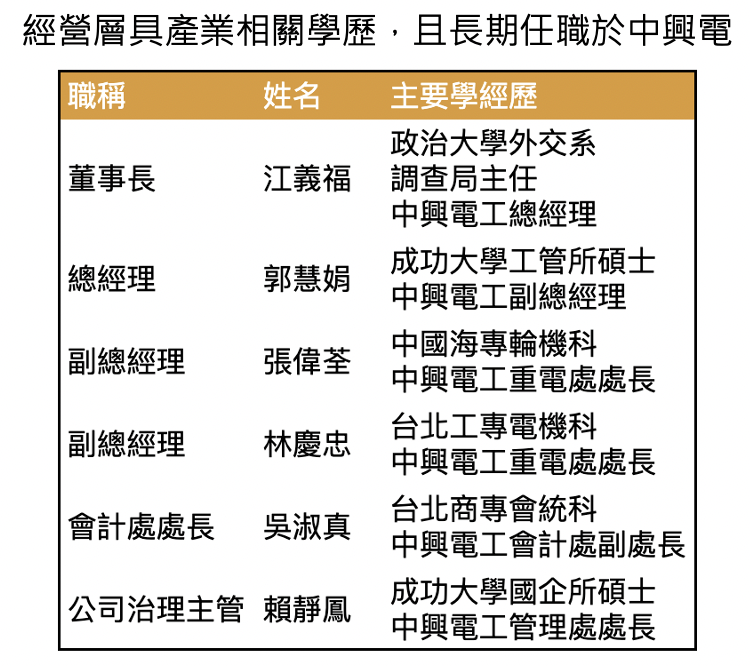 董事長江義福先生於中興電任職超過 27 年,過去曾任中興電總經理,經營團隊也具備相關產業學經歷,中興電營收長年維持穩定,並於 2020 年後因太陽能、綠電等新動能而有明顯成長,公司在目前經營層帶領下營運表現亮眼。