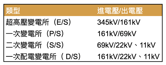 由於電廠通常建設在距離人口密集區較遠處,需提高電壓減少輸電損失,並由變電所進行降壓以符合不同用戶用電需求。目前台灣變電所依電壓等級可分為超高壓變電所、一次變電所、二次變電所及一次配電變電所,其中適配的設備也根據變電所電壓有所不同。