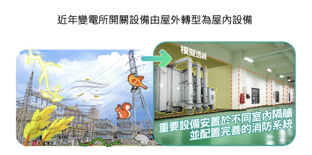 中興電的供電設備主要為 GIS 氣體絕緣開關(以下稱 GIS),為變電所中重要設備,相較於傳統屋外開關設備,具有體積小、可靠性高(密封於絕緣氣體中,不易受外部天氣影響)等特性,因此新型變電所多採屋內型 GIS。