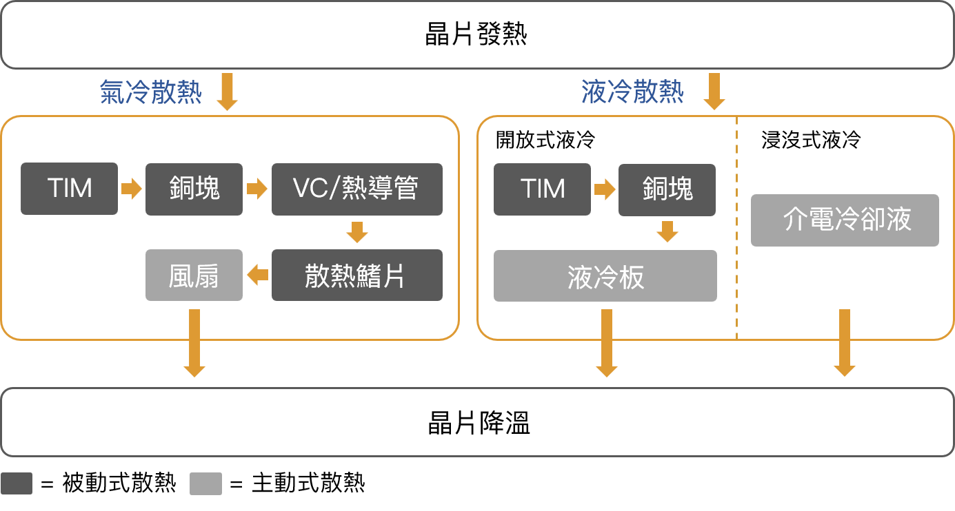 目前散熱根據最終熱傳導物質的不同,可分為傳統氣冷散熱和液冷散熱兩種。前者主要由 TIM(Thermal Interface Material,熱介面材料)、均熱片(VC)或熱導管先將熱導出,再由散熱鰭片(Heat Sink)和風扇與空氣對流進行散熱;後者則透過液冷板(Cold Plate)或是近年興起的浸沒式散熱,透過與液體熱對流散出熱,來達到晶片降溫。