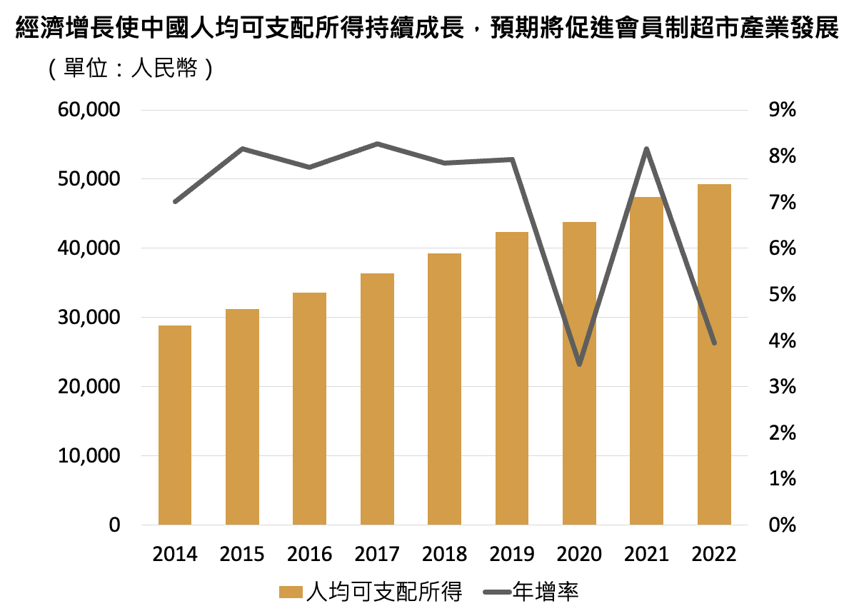 公司對於海外市場擴展一直都保持謹慎態度,以亞洲、大洋洲地區作為主要擴張據點,其中中國市場潛力大。以中國市場而言,近年因經濟增長促使人均可支出所得持續上升,2014~2022 年 CAGR+7%,預期將促進會員制超市的發展。