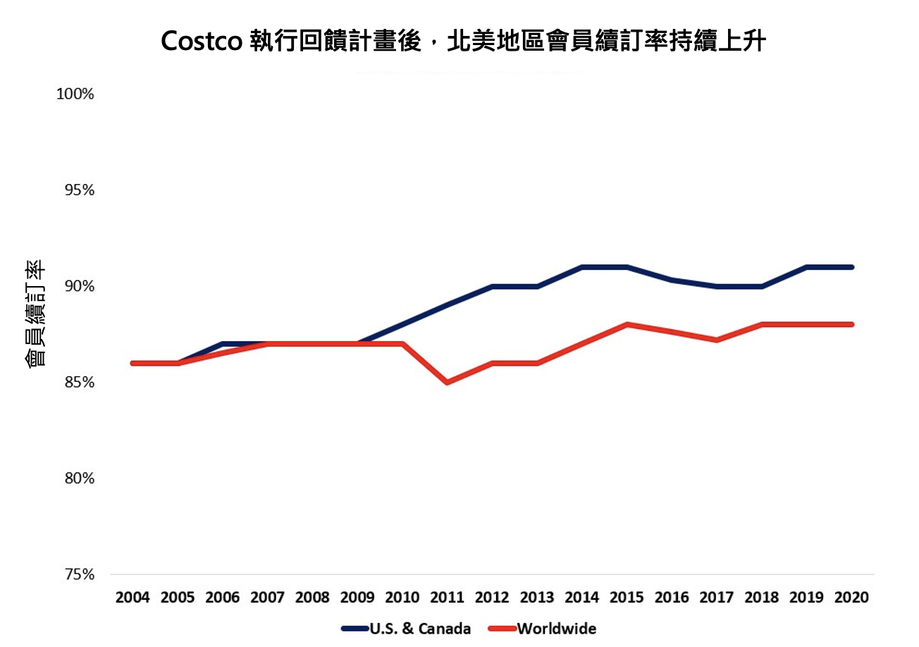 Costco 商業模式先收取會員費,並提供高性價比商品,以此提升會員續訂率、會員人數,形成正向的商業循環。