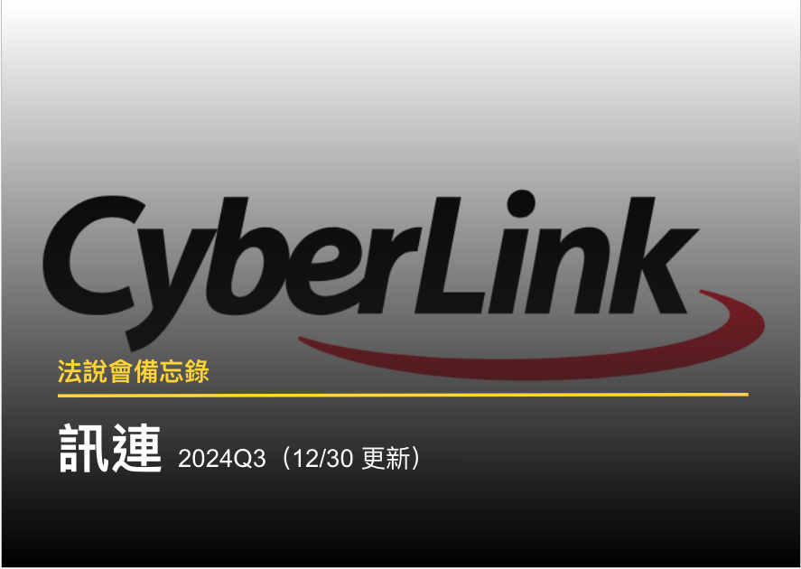 訊連(市:5203)為台灣多媒體影音軟體及 AI 臉部辨識技術開發商,主力產品包括「Promeo」、「創意導演」、「威力導演」、「相片大師」等。2024 前三季營收佔比為 create B2C(影音編輯軟體力如威力導演)約 73.2%,且營收佔比持續上升、新業務(人臉辨識) 4.2%、PC ODM/ODD(和軟體大廠綁約銷售)約 22.6%,銷售地區則為美洲 60%、日本 27%、台灣 6%、其他地區 9%。